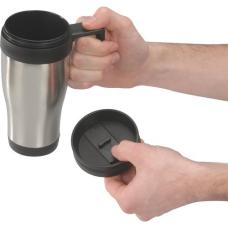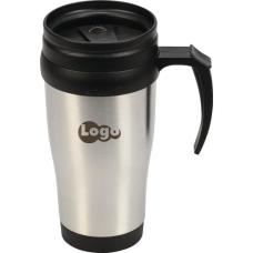 Dubbelwandige, RVS/kunststof thermosbeker met schroefdeksel en schuif-/klikopening. Niet vaatwasserbestendig. Inhoud 400 ml. Per stuk in kraft doos.