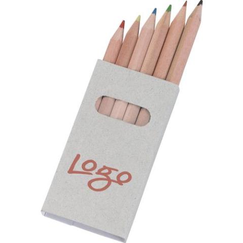 6 houten, ongelakte kleurpotloden in een gerecycled kraft doosje.