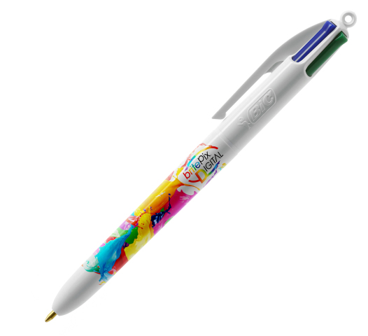 Vier verschillende inktkleuren in één! Onze iconische balpen. Schrijft in blauw, zwart, groen en rood. INCLUSIEF drukkosten digitale full colour opdruk, rondom. Enkel de instelkosten worden aangerekend.
