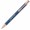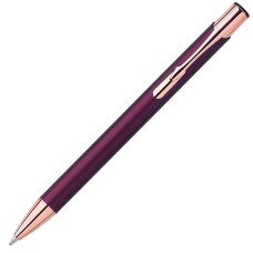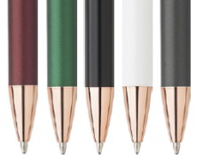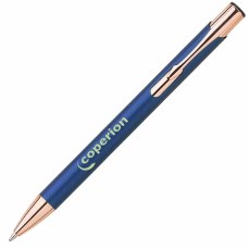 Blauwschrijvende matte aluminium balpen met roségouden accenten.