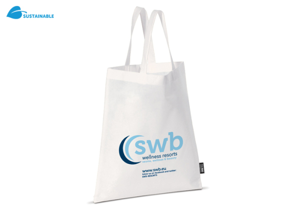 Non Woven witte draagtas met korte hengsels gemaakt van lichte vezels. Vanaf 10.000 stuks diverse afmetingen mogelijk. INCLUSIEF : in de stukprijs is reeds de drukkost in één kleur op één zijde inbegrepen. Enkel de instelkost worden aangerekend.