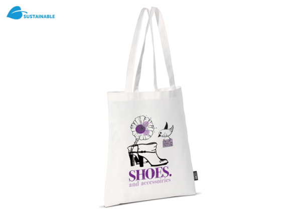 Non Woven witte schoudertas met lange hengsels gemaakt van lichte vezels. Vanaf 10.000 stuks diverse afmetingen mogelijk. INCLUSIEF : in de stukprijs is reeds de drukkost in één kleur op één zijde inbegrepen. Enkel de instelkost worden aangerekend.