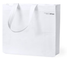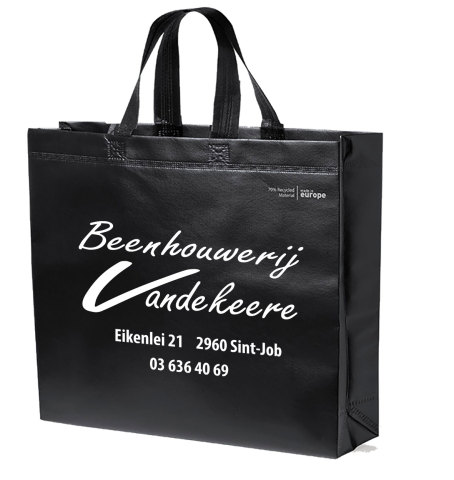 Gelamineerde draagtas, uit gerecycleerd materiaal. Met logo "made in europe".