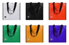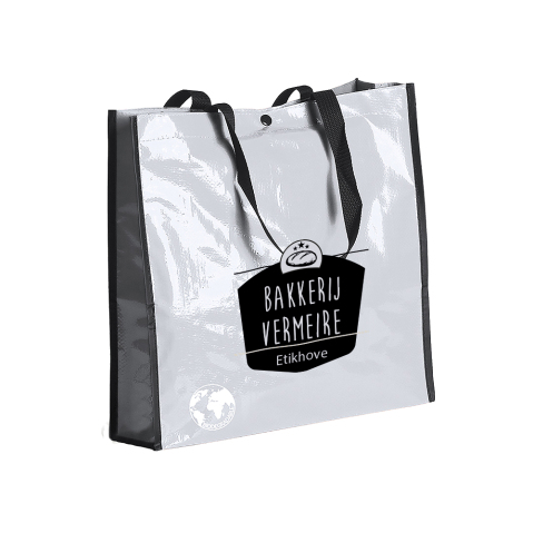 Glanzend gelamineerde afwasbare draagtas, met zwarte zijkanten en zwarte hengsels.