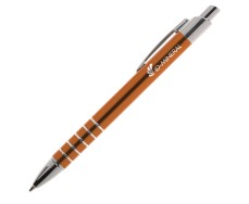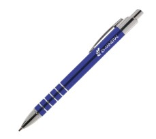 Blauwschrijvende, aluminium balpen in metallic look, met metalen clip en tussenringen.