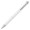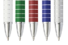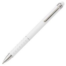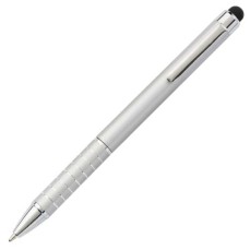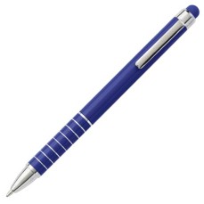 Blauwschrijvende metalen balpen met rubberen touch screen top.