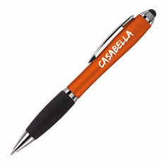 Blauwschrijvende balpen met zwarte rubberen grip en top voor "touch screen" schermen.