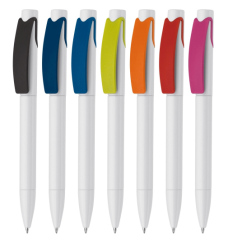 Blauwschrijvende balpen met brede clip. Ook de clip kan bedrukt worden (prijs op aanvraag). Drukkosten voor 1 kleur op 1 zijde zijn inbegrepen. Enkel de instelkosten worden aangerekend.