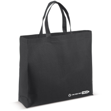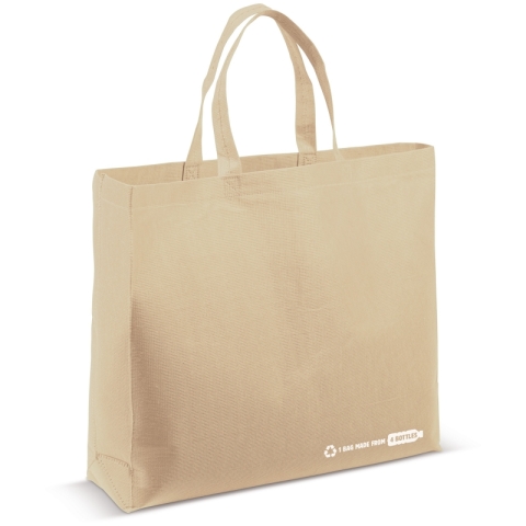 Vier gerecyclede PET flessen zijn hergebruikt voor het materiaal van deze tas. Help met deze tas mee om het plastic afval te verminderen. Door de extra brede bodem en zijkant is dit model extra groot. De drukkost voor één kleur op één zijde is inbegrepen. Enkel de instelkosten worden aangerekend.